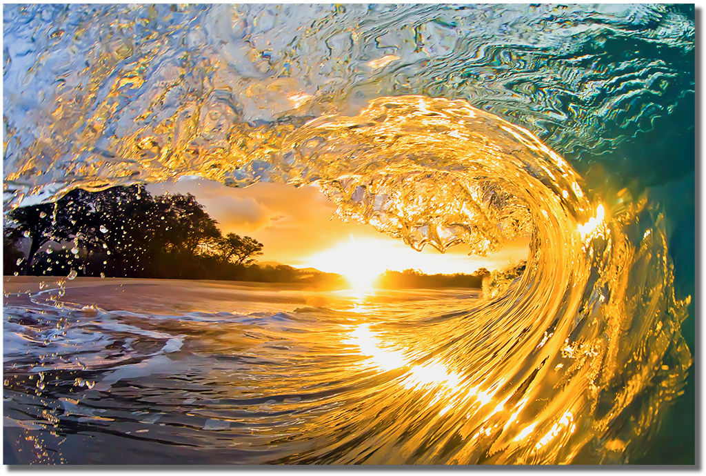 "Sunrise Barrel" A perfect barrel reflecting a glorious sunrise at Makena's 'Big Beach' with droplets 'raining' off the curl. The sun's rays uniquely vibrant due to 'voggy' weather. "Vog" is a volcanic haze that spreads across the island chain.