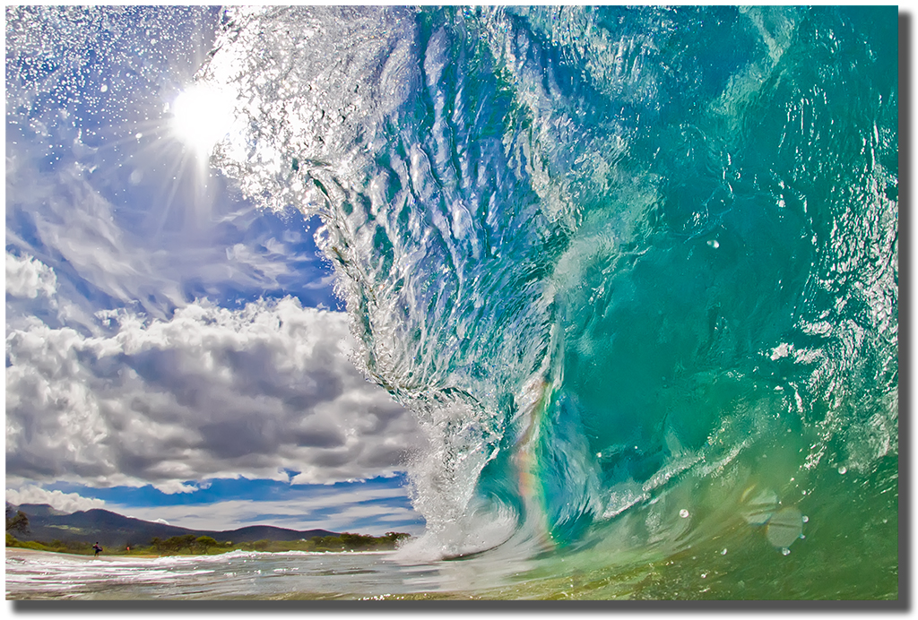 A huge shorebreak on Maui's Big Beach attracts the local boys who love to boodie board.  The bright sunrise illuminates the tube reflecting a rainbow in the curl.