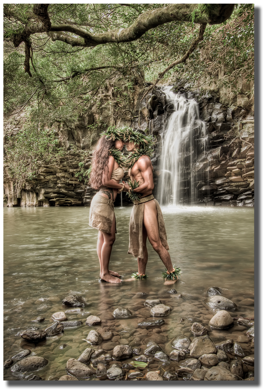 Local accomplished hula dancers Joey and Kawika Dang grab a 'secret moment' together under a waterfall in traditional 'kahiko' (old time) dress. Joey is a talented costume designer and created their authentic dress.