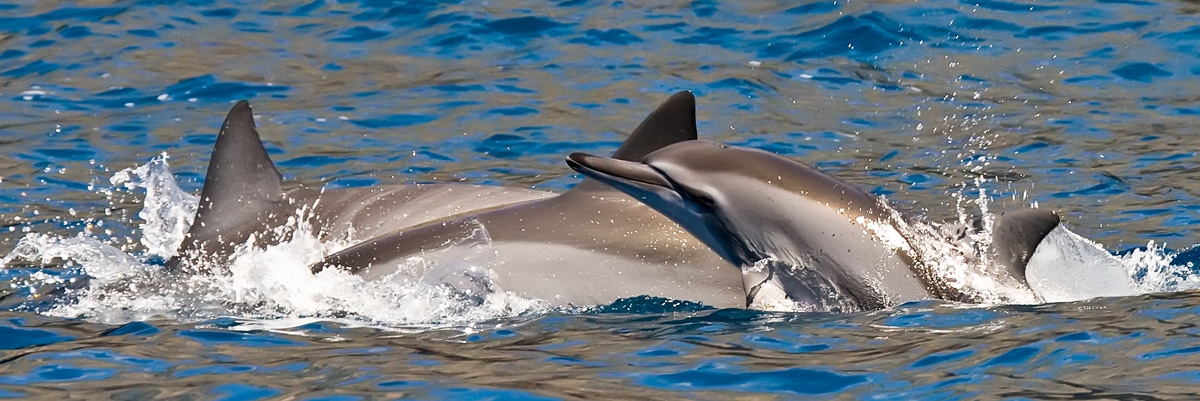 We ran into a HUGE pod of dolphins as we returned from a Rotary service project on the island of Lana'i. They surrounded us for an hour, swimming joyfully past... Mark captured the joy of this little one keeping up with the pack!