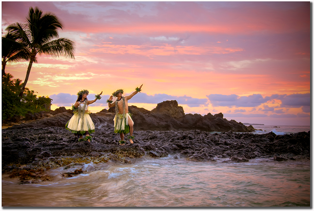 Hula dancers Joey and Kawika Dang greet the day by the sea amidst the lava rocks