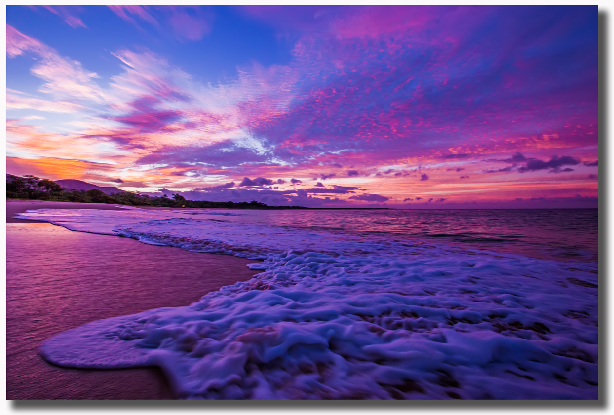Sunrise at Makena Beach State park glows with rich hues of lavender and magenta on this spectacular morning. Calm seas brought luscious foamy shores.