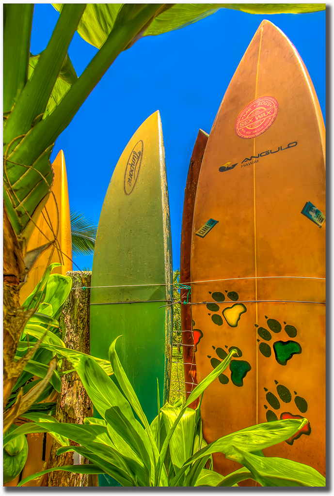 A fun, colorful section of the world famous surfboard fence in Haiku Maui. Reggae Paws shows off this retired Angula surfboard featuring the classic reggae colors of Black, Yellow, Red and Green in a cool paw print amongst Maui’s blue sky and lush plants.